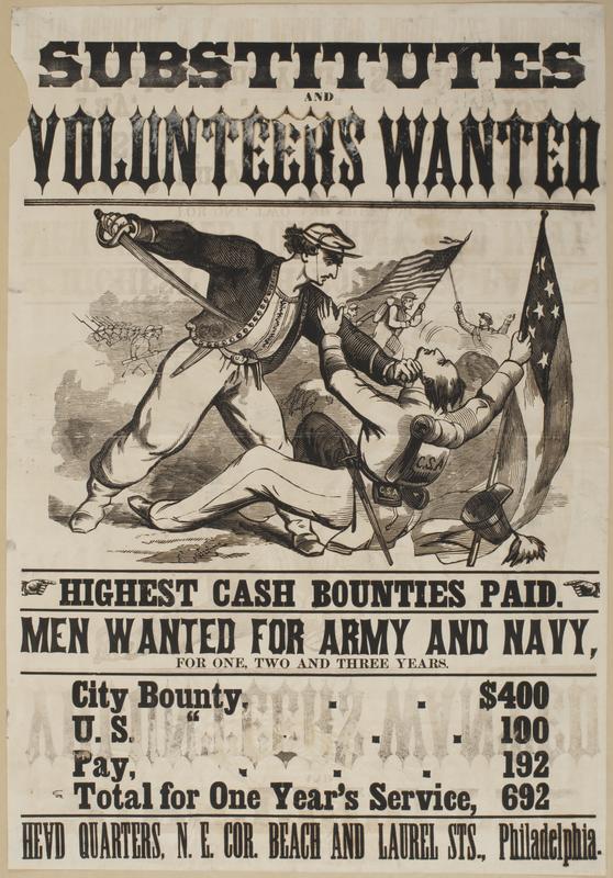Substitutes and volunteers wanted : Highest cash bounties paid. Men wanted for Army and Navy, for one, two and three years. City bounty $400 U.S. " 100 Pay 192 Total for one year's service, 692 Head quarters, N.E. cor. Beach and Laurel Sts., Philadelphia.
