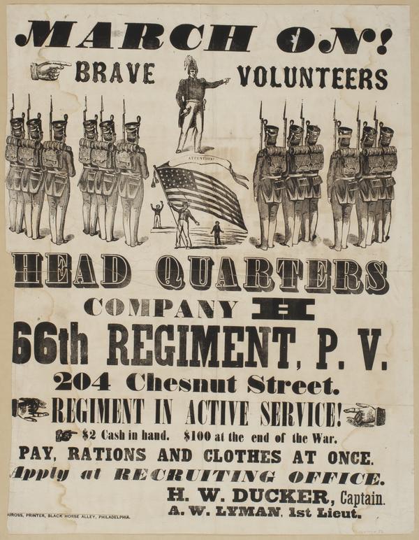 March on! Brave volunteers : Head quarters Company H 66th Regiment, P.V. 204 Chesnut Street. Regiment in active service! $2 cash in hand. $100 at the end of the war. Pay, rations and clothes at once. Apply at recruiting office. / H.W. Ducker, Captain. A.W. Lyman, 1st Lieut.