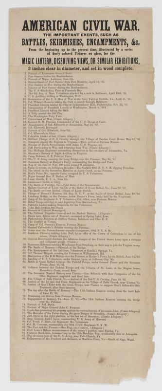 American Civil War, the important events, such as battles, skirmishes, encampments, &c. : from the beginning up to the present time, illustrated by a series of finely colored pictures on glass, for the magic lantern, dissolving views, or similar exhibitions, 3 inches in diameter, and set in wood complete. ...