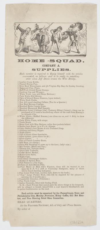 Home squad. Company A. Supplies. : Each member is required to equip himself with the articles enumerated, as follows: and to be ready in marching order when Jeff Davis crosses the Wire Bridge. ... N.B.--Each private that cannot pack the above things in his knapsack, will be obliged to furnish himself with a coal heaver's wheelbarrow, and to gather huckleberries on the road. Each article must be examined by the Pennsylvania State and Philadelphia City, Mouldy Provision, Hidey Coffee, Gill Net Blanket, and Pine Shaving Soled Shoe Committee. Headquarters, at the Feather Foundry, 4th of July and Plum Streets. By order of [blank]