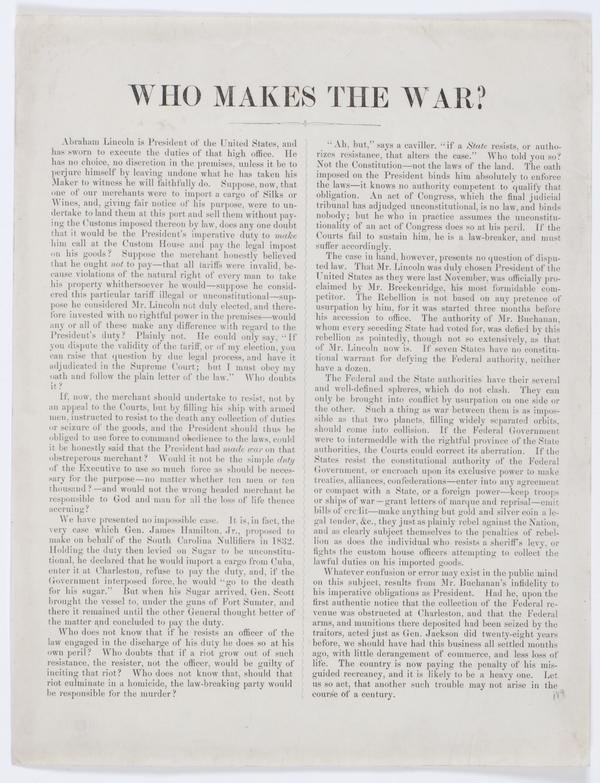 Who makes the war? : Abraham Lincoln is president of the United States, and has sworn to execute the duties of that high office. ...