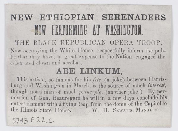 New Ethiopian Serenaders now performing at Washington. : The Black Republican Opera Troop, now occupying the White House, respectfully inform the public that they have, at great expense to the nation, engaged the celebrated clown and acrobat, Abe Linkum, This artiste, so famous for his fete (a joke) between Harrisburg and Washington in March, is the source of much interest, though not a man of much principle. (another joke.) By permission of Gen. Beauregard he will in a few days conclude his entertainment with a flying leap from the dome of the Capitol to the Illinois State House. W.H. Seward, manager.