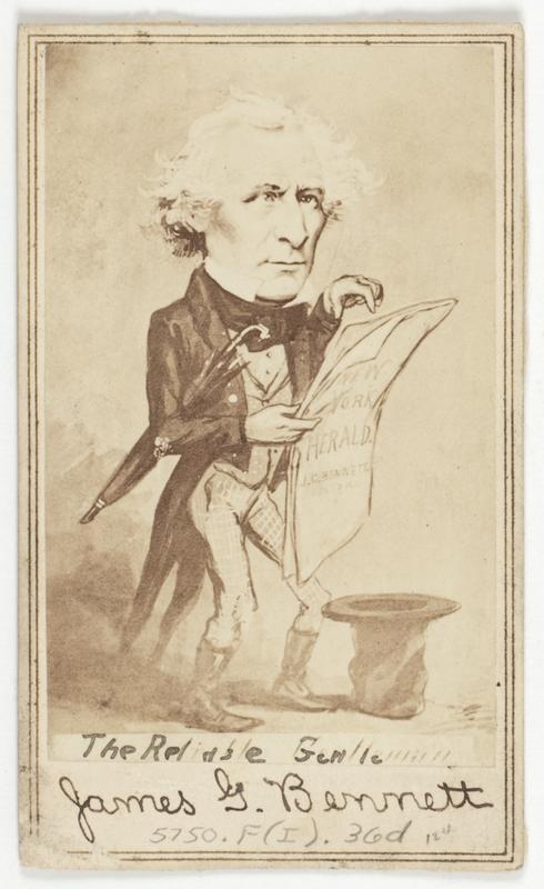 Photographic reproduction of a caricature of James Gordon Bennett, publisher of the newspaper, The New York Herald. Shows Bennett with an umbrella under his arm, his hat at his feet, and an edition of his newspaper in hand.