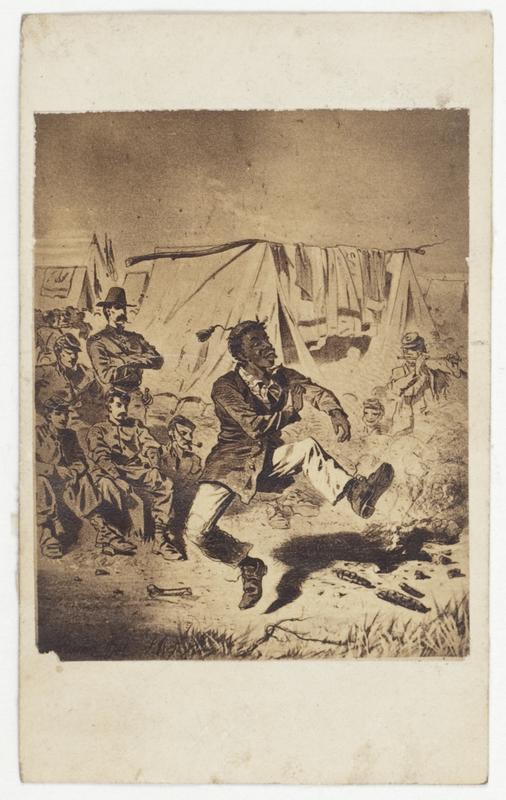 fires to play cards; get coffee; and watch the African American man camp hand, portrayed as a racist caricature, dance. Also