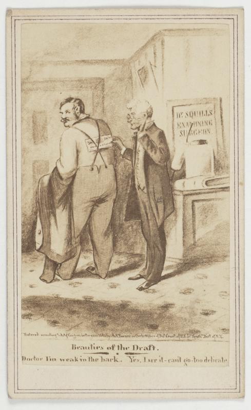 Series of six scenes satirizing the inequities and consequences of the Civil War draft. Shows a man bribing a Doctor to declare
