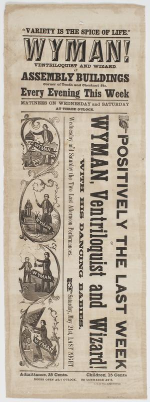 Wyman! ventriloquist and wizard, : at Assembly Buildings corner of Tenth and Chestnut Sts. every evening this week Matinees on Wednesday and Saturday at three o'clock. Positively the last week of Wyman, ventriloquist and wizard! With his dancing babies. Wednesday and Saturday the two last afternoon performances. Saturday, May 21st, last night Admittance, 25 cents. Children, 15 cents Doors open at 7 o'clock. To commence at 8.