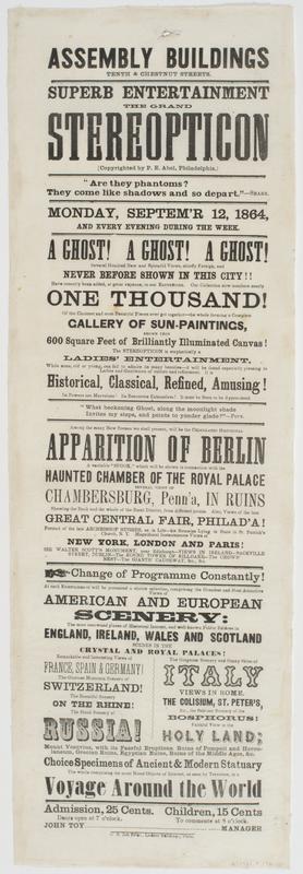 Superb entertainment The grand stereopticon : (Copyrighted by P.E. Abel, Philadelphia.) ... Monday, Septem'r 12, 1864, and every evening during the week. A ghost! A ghost! A ghost! Several hundred new and splendid views, chiefly foreign, and never before shown in this city!! ... Among the many new scenes we shall present, will be the cedebrated [sic] historical apparition of Berlin ... Change of programme constantly! At each entertainment will be presented a choice selection, comprising the grandest and most attractive views of American and European scenery: ... Admission, 25 cents. Children, 15 cents Doors open at 7 o'clock. To commence at 8 o'clock. / John Toy manager