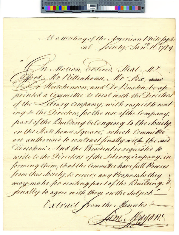 B10F38 - Extract from minutes of American Philosophical Society regarding renting part of building on State House Square to the library, 1789-01-16.pdf-1