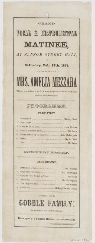 Grand vocal & instrumental matinee, at Sansom Street Hall, : on Saturday, Feb. 28th, 1863, for the benefit of Mrs. Amelia Mezzara who has been a nurse in the U.S. Army hospitals, and in the field, since the First Battle at Bull Run. ... Programme. ... To conclude with The Gobble family! ... Doors open at 1 o'clock; matinee commences at 2 1/2.
