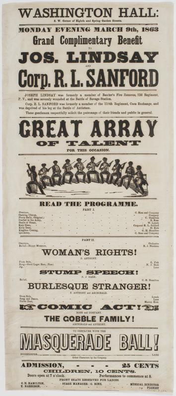 Grand complimentary benefit to Jos. Lindsay and Corp. R.L. Sanford : Joseph Lindsay was formerly a member of Baxter's Fire Zouaves, 72d Regiment, P.V., and was severely wounded at the Battle of Savage Station. Corp. R.L. Sanford was formerly a member of the 118th Regiment, Corn Exchange, and was deprived of his leg at the Battle of Antietam. These gentlemen respectfully solicit the patronage of their friends and public in general. Great array of talent for this occasion. Read the programme. ... Woman's rights! ... Stump speech! ... Burlesque stranger! ... Comic act! ... The Gobble family! ... To conclude with The masquerade ball! ... Admission, 25 cents Children, 10 cents. Doors open at 7 o'clock. Performances to commence at 8. Front seats reserved for ladies. / C.H. Hamilton, stage manager G. Rinz, musical director T. Harrison, pianist