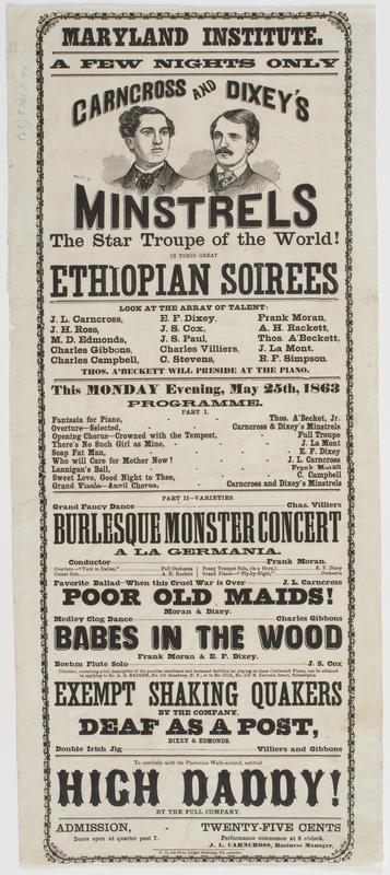Maryland Institute. A few nights only : Carncross and Dixey's Minstrels the star troupe of the world! In their great Ethiopian
