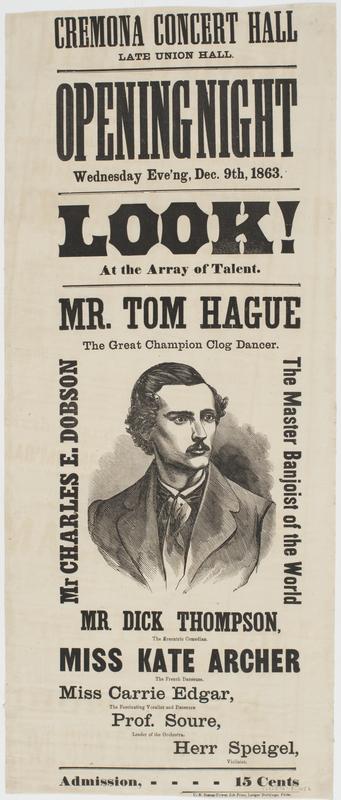 Cremona Concert Hall late Union Hall. Opening night Wednesday eve'ng, Dec. 9th, 1863. : Look! at the array of talent. Mr. Tom Hague the great champion clog dancer. Mr Charles E. Dobson the master banjoist of the world Mr. Dick Thompson, the eccentric comedian. Miss Kate Archer the French danseuse. Miss Carrie Edgar, the fascinating vocalist and danseuse Prof. Soure, leader of the orchestra. Herr Speigel, violinist. Admission, 15 cents