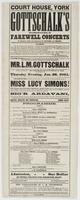 Court House, York Gottschalk's positively farewell concerts in America, before his departure for Havana and Mexico. : ... Signor Muzio has the honor to inform the public that he has succeeded in making an arrangement with the world-renowned pianist and composer, Mr. L.M. Gottschalk to give a series of grand concerts in the principal cities of the United States, prior to his departure for Havana and Mexico. Mr. Gottschalk's farewell concert in York, will take place on Thursday evening, Jan. 26, 1865. Signor Muzio also takes great pleasure to announce that he has secured the services of Miss Lucy Simons! ... Sig'r Ardavani, ... Admission, one dollar No extra charge for reserved seats. ... Doors open quarter past 7. To commence at 8 o'clock ...