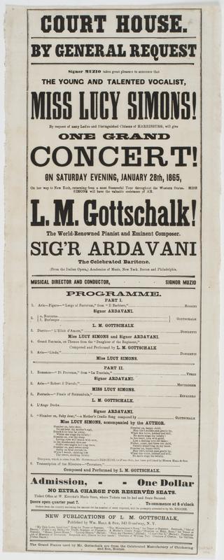 Court House. By general request Signor Muzio takes great pleasure to announce that the young and talented vocalist, Miss Lucy Simons! by request of many ladies and distinguished citizens of Harrisburg, will give one grand concert! On Saturday evening, January 28th, 1865, on her way to New York, returning from a most successful tour throughout the western states. Miss Simons will have the valuable assistance of Mr. L.M. Gottschalk! The world-renowned pianist and eminent composer. Sig'r Ardavani the celebrated baritone, ... Admission, one dollar No extra charge for reserved seats. ... Doors open quarter past 7. To commence at 8 o'clock ...