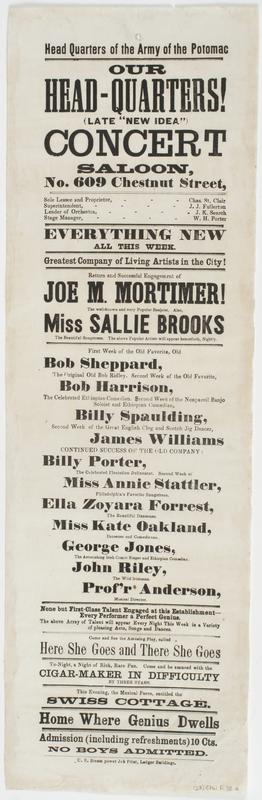 Head quarters of the Army of the Potomac Our Head-Quarters! (late "New Idea") Concert Saloon, : No. 609 Chestnut Street, (above Sixth.) Sole lessee and proprietor, Chas. St. Clair Superintendent, J.J. Fullerton Leader of orchestra, J.K. Search Stage manager, W.H. Porter Everything new all this week. Greatest company of living artists in the city! Return and successful engagement of Joe M. Mortimer! the well-known and very popular banjoist, Also, Miss Sallie Brooks the beautiful songstress. The above popular artists will appear henceforth, nightly. First week of the old favorite, Old Bob Sheppard, the original Old Bob Ridley. Second week of the old favorite, Bob Harrison, the celebrated Ethiopian comedian. Second week of the nonpareil banjo soloist and Ethiopian comedian, Billy Spaulding, second week of the great English clog and Scotch jig dancer, James Williams Continued success of the old company: Billy Porter, the celebrated plantation delineator. Second week of Miss Annie Stattler, Philadelphia's favorite songstress. Ella Zoyara Forrest, the beautiful danseuse. Miss Kate Oakland, danseuse and comedienne. George Jones, the astonishing Irish comedic singer and Ethiopian comedian. John Riley, the wild Irishman. Prof'r Anderson, musical director. ... Come and see the amusing play, called Here she goes and there she goes ... Come and be amused with the Cigar-maker in difficulty by three stars. This evening, the musical farce, entitled The Swiss cottage. Home where genius dwells Admission (including refreshments) 10 cts. Come & see. No boys admitted.