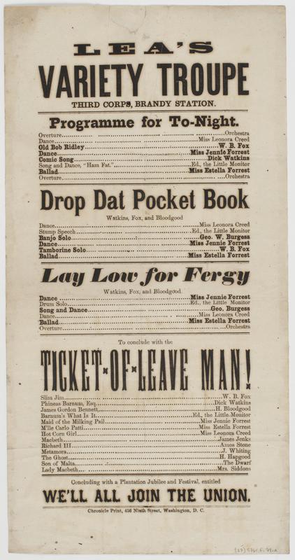 Lea's Variety Troupe Third Corps, Brandy Station. : Programme for to-night. ... Drop dat pocket book ... Lay low for Fergy
