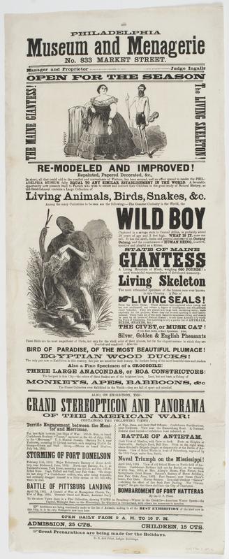 Philadelphia Museum and Menagerie : No. 833 Market Street. Manager and proprietor Judge Ingalls Open for the season. The Maine giantess! The living skeleton! Re-modeled and improved! Repainted, papered decorated, &c., in short, all that could add to the comfort and convenience of visitors, has been secured, and no effort spared to render the Philadelphia Museum fully equal to any similar establishment in the world. A favorable opportunity to parents who wish to amuse and instruct their children in the great study of natural history, as this establishment contains a large collection of living animals, birds, snakes, &c. Among the many curiosities to be seen are the following: the greatest curiosity in the world, the wild boy captured in a savage state in Central Africa, ... A pair of living seals! ... Also, on exhibition, the grand stereopticon and panorama of the American War! ... Open daily from 9 A.M. to 10 P.M. Admission, 25 cts. Children, 15 cts. Great preparations are being made for the holidays.