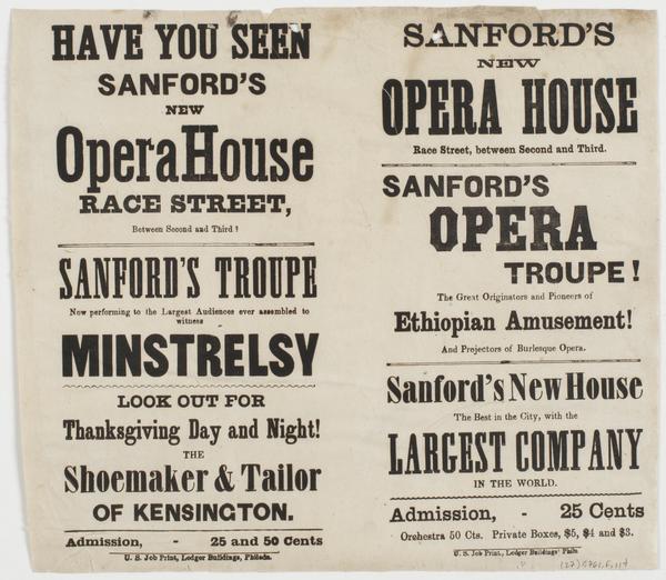 Have you seen Sanford's new Opera House Race Street, between Second and Third? : Sanford's Troupe now performing to the largest audiences ever assembled to witness minstrelsy Look out for Thanksgiving day and night! The shoemaker & tailor of Kensington. Admission, 25 and 50 cents