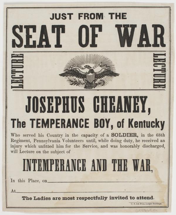 Just from the seat of war : Lecture lecture Josephus Cheaney, the temperance boy, of Kentucky who served his country in the capacity of a soldier, in the 68th Regiment, Pennsylvania Volunteers until, while doing duty, he received an injury which unfitted him for the service, and was honorably discharged, will lecture on the subject of Intemperance and the war, in this place, on [blank] at [blank] The ladies are most respectfully invited to attend.