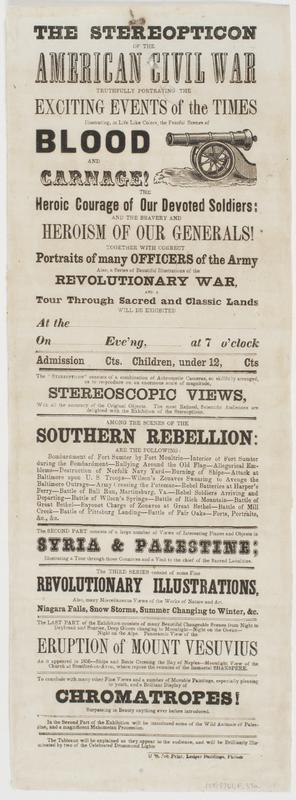 The Stereopticon of the American Civil War : truthfully portraying the exciting events of the times Illustrating, in life like colors, the fearful scenes of blood and carnage! the heroic courage of our devoted soldiers: and the bravery and heroism of our generals! ... Also, a series of beautiful illustrations of the Revolutionary War, and a tour through sacred and classic lands Will be exhibited at the [blank] on [blank] eve'ng, [blank] at 7 o'clock Admission [blank] cts. Children, under 12, [blank] cts ... The tableaux will be explained as they appear to the audience, and will be brilliantly illuminated by two of the celebrated Drummond lights