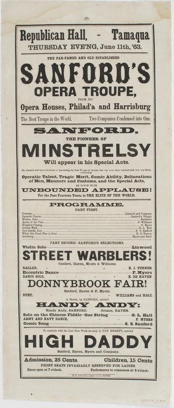 Republican Hall, Tamaqua Thursday eve'ng, June 11th, '63. : The far-famed and old established Sanford's Opera Troupe, from his opera houses, Philad'a and Harrisburg The best troupe in the world. Two companies condensed into one. Sanford, the pioneer of minstrelsy will appear in his special acts. Mr. Sanford will have the honor of presenting the best troupe of artists that has ever been concentrated into one body, embracing operatic talent, tragic merit, comic ability, delineations of men, manners and customs, and the special acts, as given with unbounded applause! for the past fourteen years, to the elite of the world. ... Street warblers! ... Donnybrook fair! ... A sketch, by Sanford, entitled Handy Andy: ... To conclude with the last new walk-around, by Dan Emmett, entitled High Daddy ... Admission, 25 cents. Children, 15 cents Front seats invariably reserved for ladies. Doors open at 7 o'clock. Performance to commence at 8 o'clock.