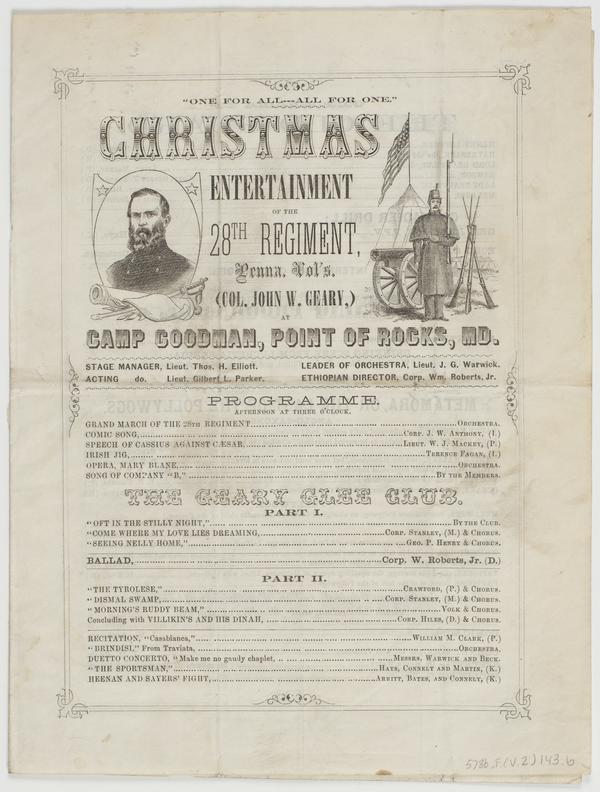 Christmas entertainment of the 28th Regiment, Penna. Vol's. (Col. John W. Geary,) : at Camp Goodman, Point of Rocks, Md. Stage manager, Lieut. Thos. H. Elliott. Acting do. Lieut. Gilbert L. Parker. Leader of orchestra, Lieut. J.G. Warwick. Ethiopian director, Corp. Wm. Roberts, Jr. Programme. Afternoon at three o'clock. ...