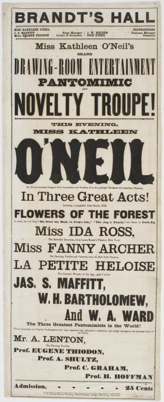 Brandt's Hall : Miss Kathleen O'Neil, proprietress J.S. Maffitt stage manager Mons. Eugene Thiodon leader of orchestra J.W. Holden business manager Dick O'Neil treasurer Miss Kathleen O'Neil's grand drawing-room entertainment pantomimic and novelty troupe! This evening, Miss Kathleen O'Neil the world-renowned original Irish comedienne and vocalist, from the principal European and American theatres, in three great acts! Including a laughable Irish sketch, The flowers of the forest in which she will sing "Oh, steer my bark to Erin's isle," "The jug o' punch," and dance an Irish jig Miss Ida Ross, ... Miss Fanny Archer ... La Petite Heloise ... Jas. S. Maffitt, W.H. Bartholomew, and W.A. Ward, the three greatest pantomimes in the world! ... Mr. A. Lenton, Prof. Eugene Thiodon, Prof. A. Schultz, Prof. C. Graham, Prof. H. Hoffman Admission, 15 cents