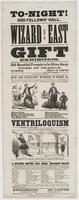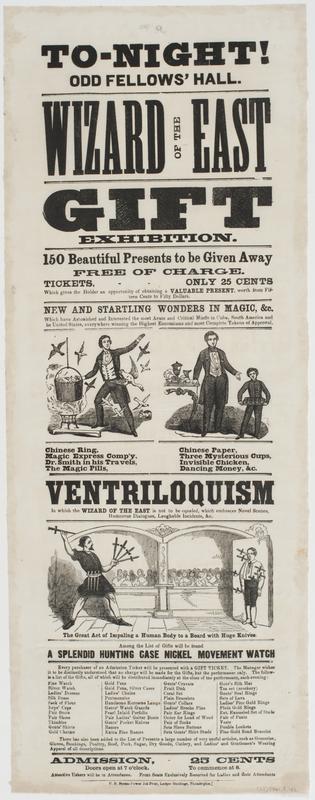 To-night! Odd Fellows' Hall. Wizard of the East Gift exhibition. : 150 beautiful presents to be given away free of charge. Tickets, only 25 cents which gives the holder an opportunity of obtaining a valuable present, worth from fifteen cents to fifty dollars. New and startling wonders in magic, ... Ventriloquism in which the Wizard of the East is not to be equaled, ... Among the list of gifts will be found a splendid hunting case nickel movement watch ... Admission, 25 cents Doors open at 7 o'clock. To commence at 8. Attentive ushers will be in attendance. Front seats exclusively reserved for ladies and their attendants.
