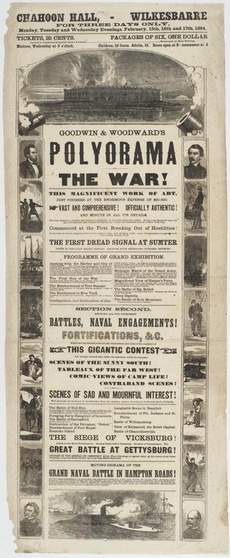 Chahoon Hall, Wilkesbarre for three days only, : Monday, Tuesday and Wednesday evenings, February 15th, 16th and 17th, 1864. Tickets, 25 cents. Packages of six, one dollar Lecture to commence at quarter-before 8 o'clock. Doors open an hour previous. Matinee, Wednesday at 3 o'clock. Children, 10 cents. Adults, 15. Doors open at 2--commence at 3 Goodwin & Woodward's Polyorama of the war! This magnificent work of art, just finished at the enormous expense of $20.000. Vast and comprehensive! Officially authentic! And minute in all its details. The only extensive, popular and complete exhibition of the kind before the public. Every scene sketched upon the spot and painted with scrupulous fidelity by a corps of celebrated artists of New York City, ... Profuse with startling dioramic effects! ...