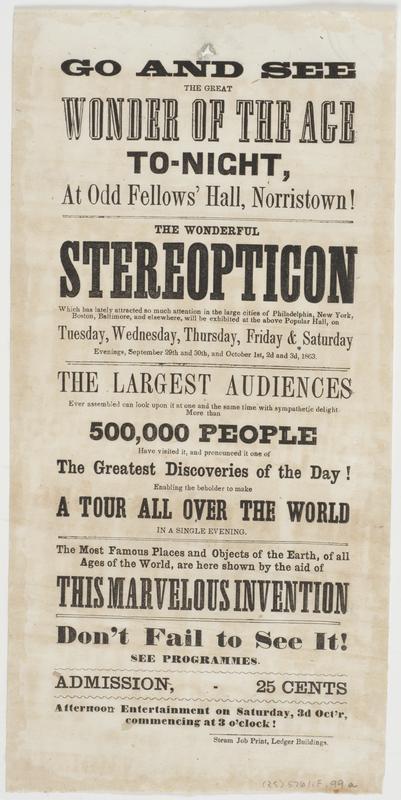Go and see the great wonder of the age to-night, at Odd Fellows' Hall, Norristown! :bThe wonderful stereopticon which has lately attracted so much attention in the large cities of Philadelphia, New York, Boston, Baltimore, and elsewhere, will be exhibited at the above popular hall, on Tuesday, Wednesday, Thursday, Friday & Saturday evenings, September 29th and 30th, and October 1st, 2d and 3d, 1863. The largest audiences ever assembled can look upon it at one and the same time with sympathetic delight. More than 500,000 people have visited it, and pronounced it one of the greatest discoveries of the day! Enabling the beholder to make a tour all over the world in a single evening. The most famous places and objects of the earth, of all ages of the world, are here shown by the aid of this marvelous invention Don't fail to see it! See programmes. Admission, 25 cents Afternoon entertainment on Saturday, 3d Oct'r, commencing at 3 o'clock!