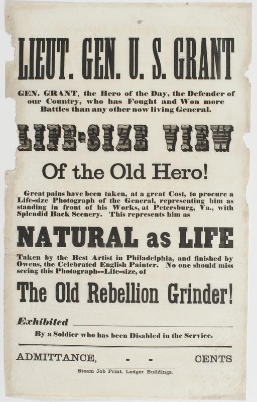 Lieut. Gen. U.S. Grant : Gen. Grant, the hero of the day, the defender of our country, who has fought and won more battles than any other now living general. Life-size view of the old hero! Great pains have been taken, at a great cost, to procure a life-size photograph of the general, representing him as standing in front of his works, at Petersburg, Va., with splendid back scenery. This represents him as natural as life taken by the best artist in Philadelphia, and finished by Owens, the celebrated English painter. No one should miss seeing this photograph--life-size, of the Old Rebellion Grinder! Exhibited [blank] by a soldier who has been disabled in the service. Admittance, [blank] cents.