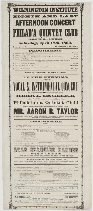 Wilmington Institute Eighth and last afternoon concert of the Philad'a Quintet Club : (conductor, Herr L. Engelke.) Saturday, April 18th, 1863, doors open at 2. To commence at half-past 2. ... Prices of admission the same as usual. In the evening a grand vocal & instrumental concert will take place for the benefit of the director of the club, Herr L. Engelke, and as a farewell to the numerous friends and patrons of the Philadelphia Quintet Club! On which occasion Herr Engelke will have the assistance of the renowned vocalist, Mr. Aaron R. Taylor the eminent and favorite basso profundo, of Philadelphia. Arrangements are also being made to increase the number of instrumental performers. ... Doors open at quarter-past 7 o'clock. Commence at 8. Admission, 25 cents Package of six tickets, one dollar. All tickets purchased for the afternoon concert, will be available for the evening concert also. Tickets to be had at the music stores of Messrs. Chas. Grobe and W. Harper; also at the principal book stores.