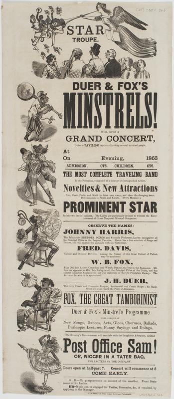 Star troupe. : Duer & Fox's Minstrels! will give a grand concert, under a pavilion capable of holding several hundred people, at [blank] on [blank] evening, [blank] 1863 Admission, [blank] cts. Children, [blank] cts. The most complete traveling band in the profession, composed of a number of distinguished artists. Novelties & new attractions Fun, music, frolic and mirth to drive care away, and cheer the drooping heart. Determination to please and amuse. Every member a prominent star in is own line of business. The ladies are particularly invited to witness the entertainment of great nonpareil minstrel companies. ... Duer & Fox's Minstrel's programme will consist of new songs, dances, acts, glees, choruses, ballads, burlesque lectures, funny sayings and doings. The evening's entertainment will conclude with the laughable afterpiece, entitled Post Office Sam! or, Nigger in a tater bag. Characters by the company. Doors open at half-past 7. Concert will commence at 8 Come early. N.B.--No postponement on account of weather. Front seats reserved for ladies. Music can be engaged for parties, serenades, &c., if required, by applying to the manager.
