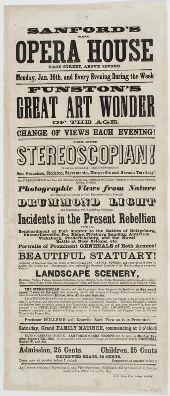 Sanford's new Opera House Race Street, above Second. Monday, Jan. 16th, : and every evening during the week Funston's great art wonder of the age. Change of views each evening! The new stereoscopian! which has produced an unparalleled sensation in San Francisco, Stockton, Sacramento, Marysville and Nevada Territory! The stereoscopian is a new and elaborate apparatus, combining the highest triumphs of optical and chemical science, by which photographic views from nature are displayed on canvass in vast dimensions with a powerful Drummond light and illustrating, with astonishing brilliancy, incidents in the present Rebellion ... Beautiful statuary! ... landscape scenery, ... Professor Hullfish will describe each view as it is presented. Saturday, grand family matinee, commencing at 2 o'clock ... Admission, 25 cents. Children, 15 cents Reserved seats, 50 cents. Doors open at quarter before 7 o'clock. Commence at quarter before 8 Any person wishing a repetition of any view previously exhibited, will be gratified by leaving word at the office during the day.