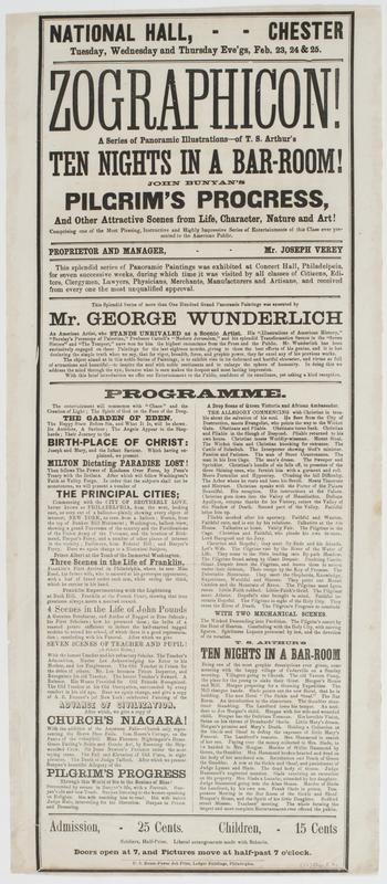 National Hall, Chester Tuesday, Wednesday and Thursday eve'gs, Feb. 23, 24 & 25. Zographicon! : A series of panoramic illustrations--of T.S. Arthur's Ten nights in a bar-room! John Bunyan's Pilgrim's progress, and other attractive scenes from life, character, nature and art! Comprising one of the most pleasing, instructive and highly impressive series of entertainments of this class ever presented to the American public. / Proprietor and manager, Mr. Joseph Verey. This splendid series of panoramic paintings was exhibited at Concert Hall, Philadelpeia [sic], for seven successive weeks, during which time it was visited by all classes of citizens, editors, clergymen, lawyers, physicians, merchants, manufacturers and artisans, and received from every one the most unqualified approval. This splendid series of more than one hundred grand panoramic paintings was executed by Mr. George Wunderlich an American artist, ... The object aimed at in this noble series of paintings, is to exhibit vice in its deformed and hurtful character, and virtue as full of attractions and beautiful ... Admission, 25 cents. Children, 15 cents Soldiers, half-price. Liberal arrangements made with schools. Doors open at 7, and pictures move at half-past 7 o'clock.