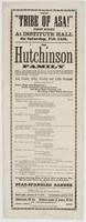 The "Tribe of Asa!" First night at Institute Hall : on Saturday, Feb. 14th. The Hutchinson Family grateful to their numerous friends and patrons for the continued success and increased crowds which have thronged their concerts in days of "Auld Lang Syne," respectfully announce in this, their twenty-third annual musical pilgrimage through their native land, one concert on the above evening, all will appear, Asa, Lizzie, Abby, Freddy and little Dennett singing their songs of home, hope and happiness! Faith, freedom and fraternity! The good time coming, and the flag of our Union forever! Together with the productions of Whittier, Longfellow, Morris, Saxe, Root and Work, Miss Edna Dean Proctor, Lucy Larcum and Florence Percy, besides several original compositions by the Hutchinsons, ... Doors open, quarter of 7 o'cl'k. Commences, quarter of 8 Admission, 25 cts. Children under 12 years, 15 cts No postponement. / Seth C. Chace, agent.