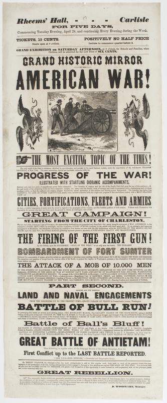 Rheems' Hall, Carlisle for five days, : commencing Tuesday evening, April 28, and continuing every evening during the week. Tickets, 15 cents. Positively no half price Doors open at 7 o'clock. Lecture to commence quarter-before 8. Grand exhibition on Saturday afternoon, at 3 o'clock, for schools and families, when children will be admitted for the low price of six cents. Grand historic mirror of the American war! The most exciting topic of the times! The only work of the kind in existence, sketched by eye-witnesses, and painted by the most eminent artists, under the supervision of the well-known Pearson Brothers, of New York. ... Mr. Robert Pearson, the principal artist, has made arrangements to add to this popular work, from week to week, all the principal events that may transpire in the prosecution of the war, having distinguished artists engaged to forward to him sketches and reports prepared on the spot. ... The unseemly daubs which are generally produced for public inspection, under the name of panoramas, have, in a great measure, shaken the confidence of the people; ... It is necessary, therefore, to inform all classes that this panorama has met with the most unbounded success, having been exhibited within the past few months, in Philadelphia, to not less than 75,000 spectators. / D. Woodward, manager.