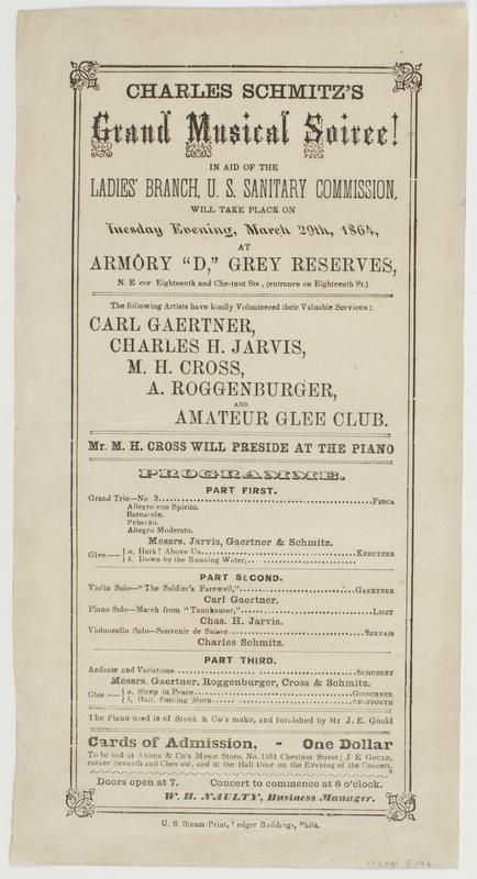 Charles Schmitz's grand musical soiree! : In aid of the Ladies' Branch, U.S. Sanitary Commission, will take place on Tuesday evening, March 29th, 1864, at Armory "D," Grey Reserves, N.E. cor. Eighteenth and Chestnut Sts., (entrance on Eighteenth St.) The following artists have kindly volunteered their valuable services: Carl Gaertner, Charles H. Jarvis, M.H. Cross, A. Roggenburger, and Amateur Glee Club. Mr. M.H. Cross will preside at the piano ... The piano is of Steck & Co's make, and furnished by Mr. J.E. Gould Cards of admission, on dollar to be had at Andrew & Co's Music Store, No. 1104 Chestnut Street; J.E. Gould, corner Seventh and Chestnut, and at the hall door on the evening of the concert. Doors open at 7. Concert to commence at 8 o'clock. W.H. Naulty, business manager.