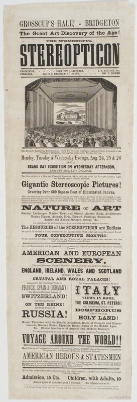 Grosscup's Hall, Bridgeton The great art-discovery of the age! The wonderful stereopticon : Proprietor, John Toy Operator, Prof. E.B. Merchants Lecturer, E.E. Hulfish, Esq. Agent, Wm. F. Decker This beautiful intellectual entertainment, which will be found to surpass anything hitherto presented to the citizens of Bridgeton, will be given at the above popular hall, on Monday, Tuesday & Wednesday eve'ngs, Aug. 24, 25 & 26 Also a grand day exhibition on Wednesday afternoon, August 26th, at 3 o'clock. The stereopticon is a new and powerful apparatus, which, with the aid of the strongest artificial light that science has yet created, produces gigantic stereoscopic pictures! covering over 600 square feet of illuminated canvas, ... At each entertainment will be presented a choice selection, comprising the grandest and most attractive views of American and European scenery, ... The whole comprising the most noted objects of interest, as seen by travelers in a voyage around the world!! Each evening will be presented a number of interesting local views, choice specimens of monumental sculpture, &c., and statues and colossal portraits of eminent American heroes & statesmen ... In order to afford families an opportunity of attending frequently, at a small cost, the prices have been reduced as below: Admission, 15 cts. Children, with adults, 10 Doors open at quarter-past 7 o'clock. To commence at 8.