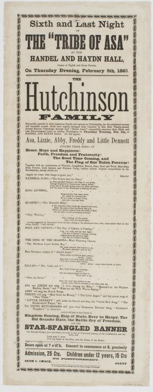 Sixth and last night of the "Tribe of Asa" at the Handel and Haydn Hall, : corner of Eighth and Green Streets, on Thursday evening, February 5th, 1863. The Hutchinson Family renewedly grateful to their numerous friends and patrons in Philadelphia, for the continued success and increased crowds, which have nightly thronged their concerts in this, their twenty-second annual musical pilgrimage through their "native land," respectfully announce their sixth and last entertainment, prior to visiting Washington, on Thursday evening, Feb. 5th, at Handel and Haydn Hall. All will appear, Asa, Lizzie, Abby, Freddy and little Dennett singing their songs of home, hope and happiness! Faith, freedom and fraternity! The good time coming, and the flag of our Union forever! Together with the productions of Whittier, Longfellow, Morris, Saxe, Root and Work, Miss Edna Dean Proctor, Lucy Larcum and Florence Percy, besides several original compositions by the Hutchinsons, ... Doors open at 7 o'cl'k. Concert to commence at 8, precisely Admission, 25 cts. Children under 12 years, 15 cts No postponement. / Seth C. Chace, agent.