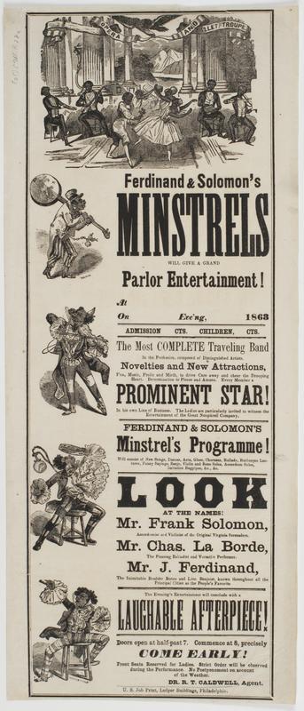 Ferdinand & Solomon's Minstrels will give a grand parlor entertainment! : At [blank] on [blank] eve'ng, [blank] 1863 Admission [blank] cts. Children, [blank] cts. The most complete traveling band in the profession, composed of distinguished artists. Novelties and new attractions, fun, music, frolic and mirth, to drive care away and cheer the drooping heart. Determination to please and amuse. Every member a prominent star! in his own line of business. The ladies are particularly invited to witness the entertainment of the great nonpareil company. Ferdinand & Solomon's Minstrel's programme! will consist of new songs, dances, acts, glees, choruses, ballads, burlesques lectures, funny sayings, banjo, violin and bone solos, accordeon solos, imitation bagpipes, &c. &c. Look at the names! Mr. Frank Solomon, accordeonist and violinist of the original Virginia Serenaders. Mr. Chas. La Borde, the pleasing balladist and versatile performer. Mr. J. Ferdinand, the inimitable Brudder Bones and lion banjoist, known throughout all the principal cities as the people's favorite The evening's entertainment will conclude with a laughable afterpiece! Doors open at half-past 7. Commence at 8, precisely Come early! Fron seats reserved for ladies. Strict order will be observed during the performance. No postponement on account of the weather. / Dr. R.T. Caldwell, agent.