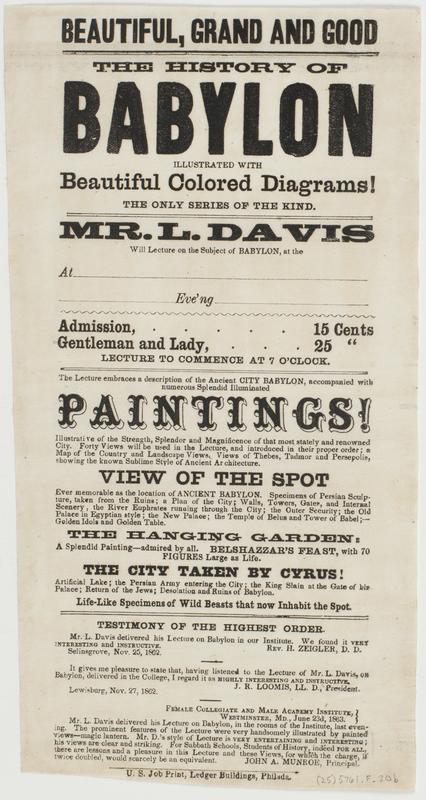 Beautiful, grand and good The history of Babylon illustrated with beautiful colored diagrams! : The only series of the kind. Mr. L. Davis will lecture on the subject of Babylon, at [blank] [blank] eve'ng [blank] Admission, 15 cents Gentleman and lady, 25 " Lecture to commence at 7 o'clock. The lecture embraces a description of the ancient city Babylon, accompanied with numerous splendid illuminated paintings! illustrative of the strength, splendor and magnificence of that most stately and renowned city. Forty views will be used in the lecture, and introduced in their proper order; a map of the country and landscape views. ... View of the spot ever memorable as the location of ancient Babylon. ... The Hanging garden: ... The city taken by Cyrus! ... Life-like specimens of wild beasts that now inhabit the spot. ...