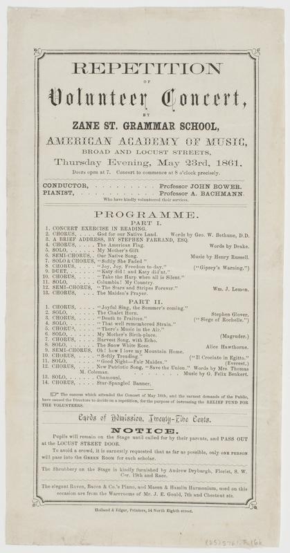 Repetition of volunteer concert, / by Zane St. Grammar School, American Academy of Music, Broad and Locust Streets, Thursday evening, May 23rd, 1861. Doors open at 7. Concert to commence at 7 o'clock precisely. Conductor, Professor John Bower. Pianist, Professor A. Bachmann. Who have kindly volunteered their services. ... Cards of admission, twenty-five cents. Notice. Pupils will remain on the stage until called for by their parents, and pass out at the Locust Street door. To avoid a crowd, it is earnestly requested that as far as possible, only one person will pass into the green room for each scholar. The shrubbery on the stage is kindly furnished by Andrew Dryburgh, florist, S.W. cor. 19th and Race. The elegant Raven, Bacon & Co.'s piano, and Mason & Hamlin harmonium, used on this occasion are from the warerooms of Mr. J.E. Gould, 7th and Chestnut sts.
