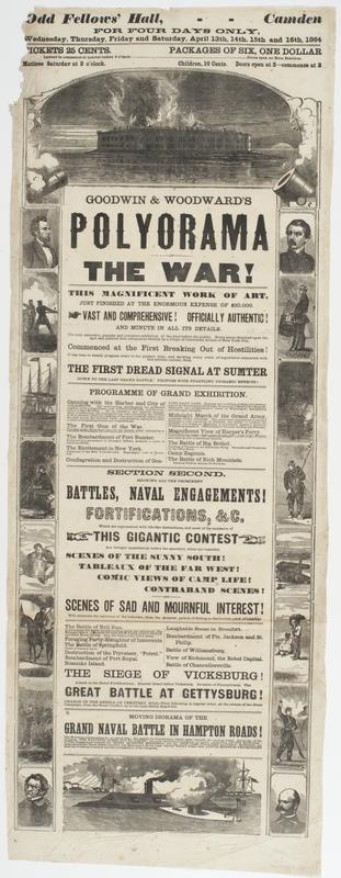 Odd Fellows' Hall, Camden for four days only, : Wednesday, Thursday, Friday and Saturday, April 13th, 14th, 15th and 16th, 1864 Tickets 25 cents. Packages of six, one dollar Lecture to commence at quarter-before 8 o'clock. Doors open an hour previous. Matinee Saturday at 3 o'clock. Children, 10 cents. Adults, 15. Doors open at 2--commence at 3 Goodwin & Woodward's Polyorama of the war! This magnificent work of art, just finished at the enormous expense of $20.000. Vast and comprehensive! Officially authentic! And minute in all its details. The only extensive, popular and complete exhibition of the kind before the public. Every scene sketched upon the spot and painted with scrupulous fidelity by a corps of celebrated artists of New York City, ... Profuse with startling dioramic effects! ...