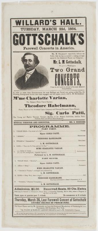 Willard's Hall. Tuesday, March 22d, 1864. Gottschalk's farewell concerts in America. : Mr. M. Strakosch respectfully informs the public that he has succeeded in making arrangements for the celebrated pianist and composer, Mr. L.M. Gottschalk, to give in Washington two grand concerts, when he will perform several of his most admired compositions. In order to make these entertainments the most brilliant and varied ever given in this city, the following distinguished artists have been engaged, and will appear jointly with L.M. Gottschalk: M'me Charlotte Varian, ... Theodore Habelmann, ... Sig. Carlo Patti, ... Musical director and conductor, Mr. S. Behrens ... Admission, $1.00. Reserved seats, 50 cts. extra ... Doors open at quarter-past 7 o'clock. To commence at 8 o'clock. Thursday, March 26, last farewell concert of Gottschalk entire change of programme. ...