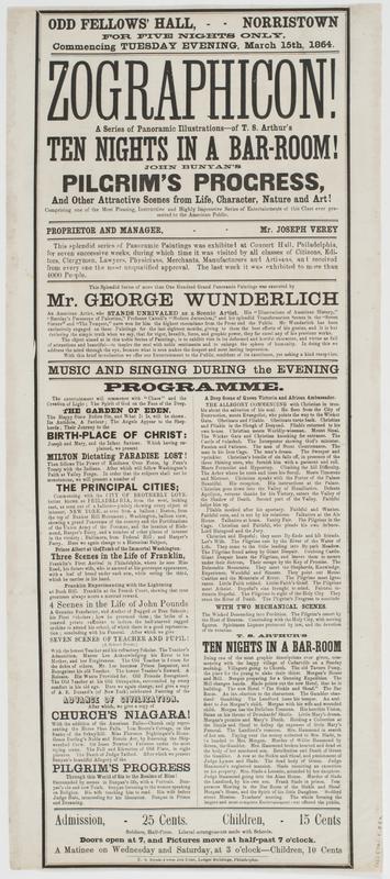 Odd Fellows' Hall, Norristown for five nights only, commencing Tuesday evening, March 15th, 1864. Zographicon! : A series of panoramic illustrations--of T.S. Arthur's Ten nights in a bar-room! John Bunyan's Pilgrim's progress, and other attractive scenes from life, character, nature and art! Comprising one of the most pleasing, instructive and highly impressive series of entertainments of this class ever presented to the American public. / Proprietor and manager, Mr. Joseph Verey. This splendid series of panoramic paintings was exhibited at Concert Hall, Philadelphia, for seven successive weeks, during which time it was visited by all classes of citizens, editors, clergymen, lawyers, physicians, merchants, manufacturers and artisans, and received from every one the most unqualified approval. The last week it was exhibited to more than 4000 people. This splendid series of more than one hundred grand panoramic paintings was executed by Mr. George Wunderlich an American artist, ... The object aimed at in this noble series of paintings, is to exhibit vice in its deformed and hurtful character, and virtue as full of attractions and beautiful ... Music and singing during the evening ... Admission, 25 cents. Children, 15 cents Soldiers, half-price. Liberal arrangements made with schools. Doors open at 7, and pictures move at half-past 7 o'clock. A matinee on Wednesday and Saturday, at 3 o'clock--Children, 10 cents.