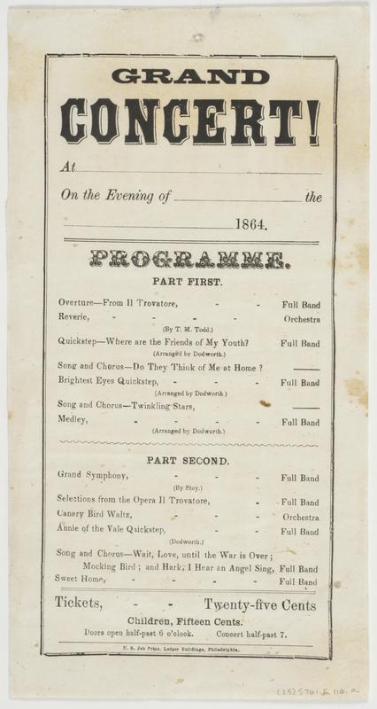 Grand concert! : At [blank] on the evening of [blank] the [blank] 1864. Programme. ... Tickets, twenty-five cents Children, fifteen cents. Doors open half-past 6 o'clock. Concert half-past 7.