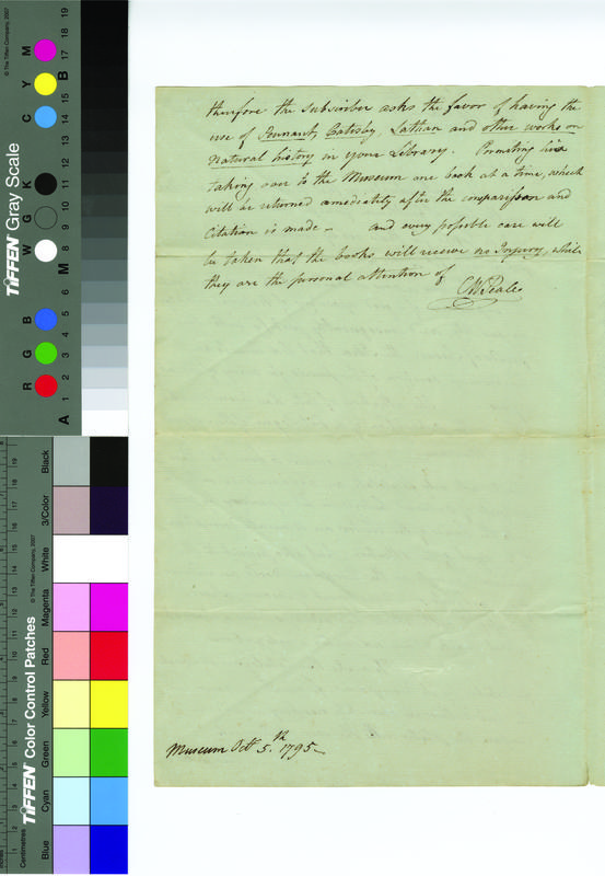B25F13 - Correspondence from Charles Willson Peale regarding loan of books as reference for a catalogue of his Museum of Natural History, 1795-10-05.pdf-2