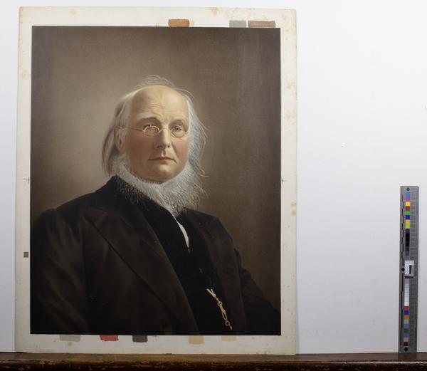 Proof of a bust-length portrait of the New York abolitionist, newspaper editor, and politician. Greeley wears a chin beard and is attired in spectacles, a white collared shirt, a black waistcoat with a gold pocket watch chain, and a black jacket.