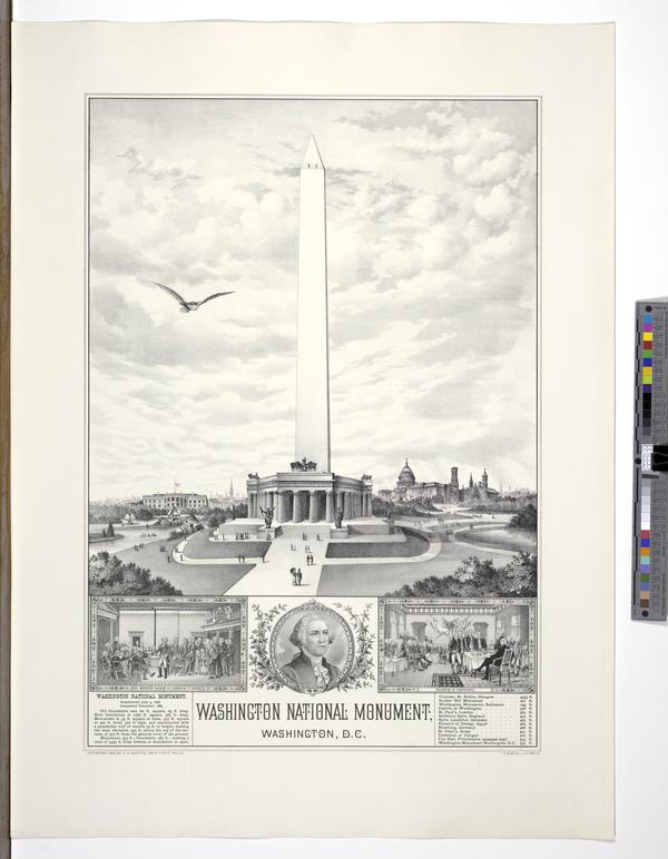 Print commemorating the Washington Monument after the designs of Robert Mills and constructed 1848 to 1884 in Washington, D.C. In the center, shows the original designs created by Mills of a large obelisk with a colonnaded building at the base. On top of the building's portico are sculptures of Washington standing in a chariot holding the reins of six horses. Flanking the staircase leading to the monument are sculptures of Patrick Henry and Jefferson. In the background, the White House and U.S. Capitol building are visible. Numerous pedestrians walk around the monument and other landmarks. An eagle soars through the air in the left. Below the image are three vignettes depicting Washington resigning his commission to Congress; a bust-length portrait of Washington; and the signing of the Declaration of Independence.